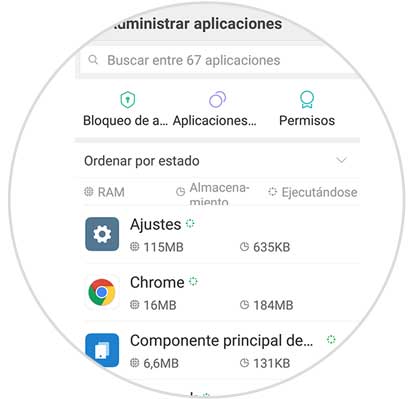 Ahora veremos todas aquellas aplicaciones que tenemos instaladas en el teléfono. Podemos ordenarlas por RAM, Almacenamiento o Ejecutándose. A continuación seleccionamos aquella aplicación de la cual queremos borrar la memoria caché.