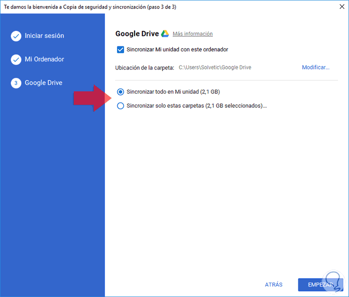 Allí podemos seleccionar si se ha de sincronizar todo lo seleccionado o solo las carpetas que definamos, pulsamos en Empezar para dar inicio al proceso de sincronización de Google Drive.
