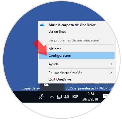 Para realizar este proceso en OneDrive, vamos a ir al icono de OneDrive ubicado en la barra de tareas y allí daremos clic derecho sobre el y seleccionamos la opción Configuración: