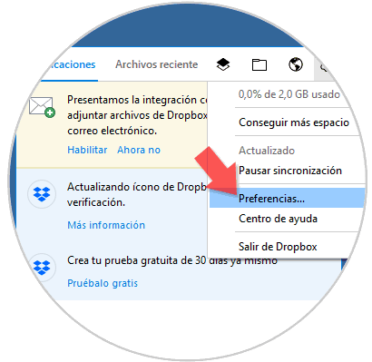 En el caso de la sincronización en Dropbox debemos pulsar en el icono de Dropbox ubicado en la barra de tareas y allí dar clic en el icono de engranaje ubicado en la parte superior derecha y seleccionaremos la opción Preferencias: