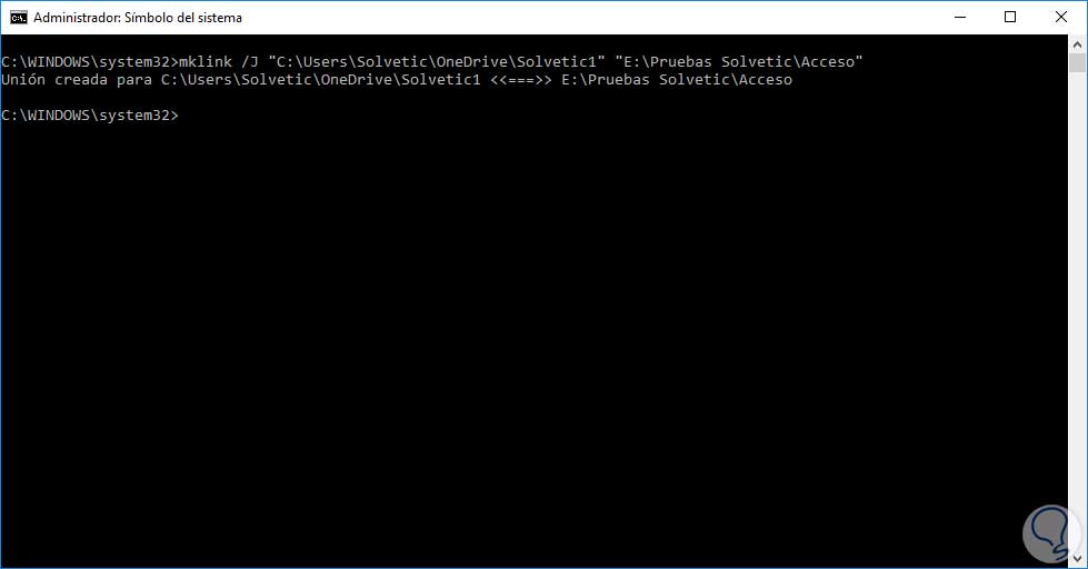 mklink /J "C:\Users\Solvetic\OneDrive\Solvetic1" "E:\Pruebas Solvetic\Acceso"