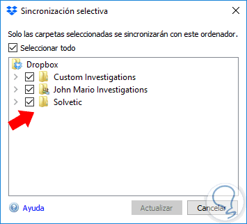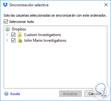 Allí pulsamos en el botón Sincronización selectiva y en la ventana desplegada veremos las carpetas activas de Dropbox: