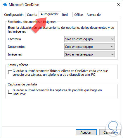 Será desplegada la siguiente ventana donde vamos a la pestaña Autoguardar y allí podremos ver las carpetas que por defecto sincroniza OneDrive:
