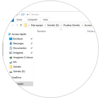 Para este ejemplo, hemos creado una carpeta llamada Acceso dentro de otra llamada Pruebas Solvetic en la unidad E:
