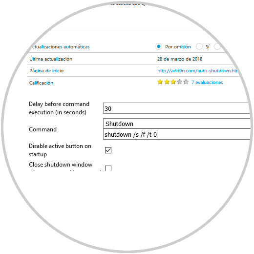 Para configurar esto, vamos al menú de Firefox y allí seleccionamos Complementos, en la ventana desplegada vamos a la sección Extensiones y podremos configurar los valores de Auto Shutdown según sea necesario. Una vez realicemos los cambios pulsamos en el botón Guardar.
