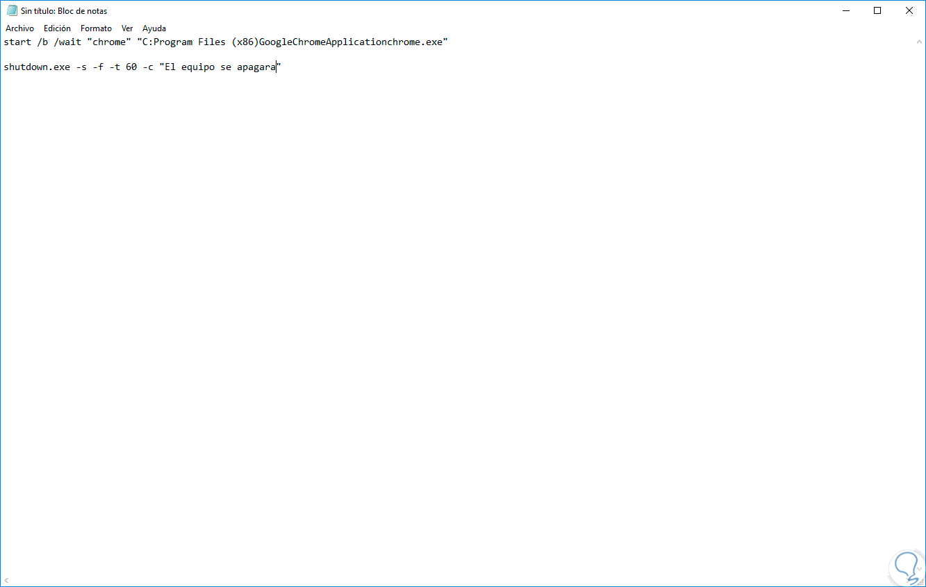 Allí debemos ingresar la ruta correcta de Google Chrome según sea el caso. Este archivo debemos guardarlo con la extensión .bat. La primera línea del archivo por lotes abrirá el navegador y esperará a que termine el proceso de descarga, mientras que la segunda línea del archivo por lotes se ejecutará cuando finalice Chrome.