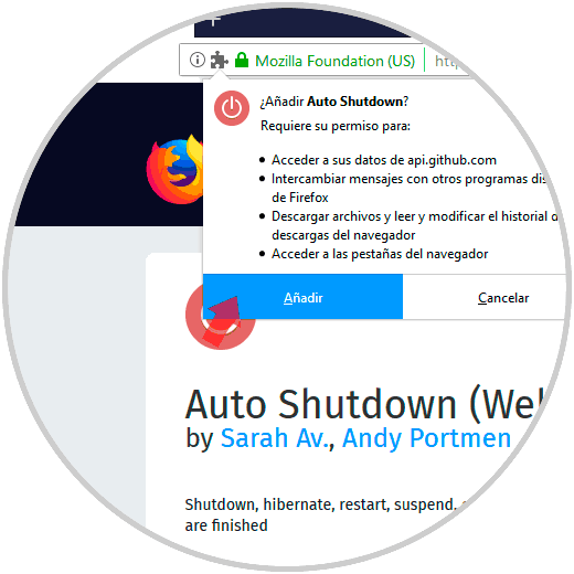 Para Firefox Quantum tenemos la opción de usar el complemento Auto Shutdown el cual podemos instalar de forma gratuita en el siguiente enlace: