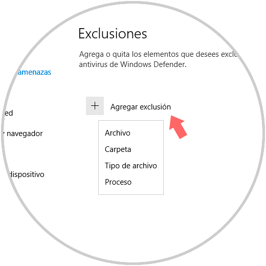 Allí damos clic en la línea “Agregar o quitar exclusiones” y en la nueva ventana pulsamos en el botón “Agregar exclusión” y seleccionamos el tipo de elemento a excluir: