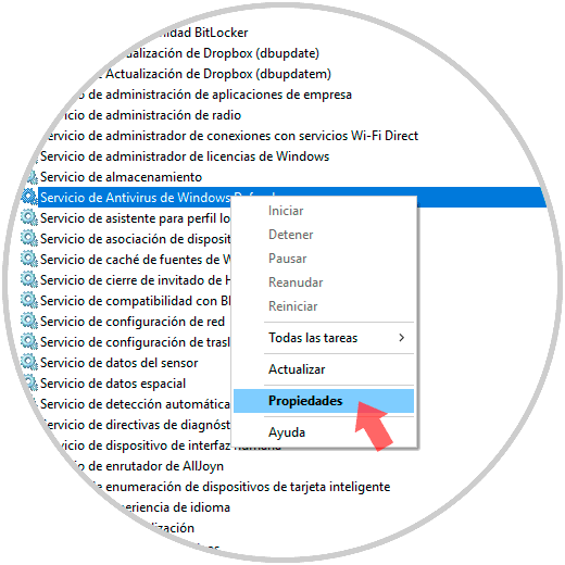 Pulsamos Enter o Aceptar. En la ventana desplegada, ubicaremos el servicio llamado “Servicio de antivirus de Windows Defender” y daremos clic derecho sobre el para seleccionar la opción “Propiedades”:
