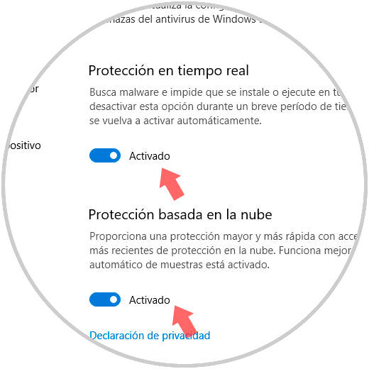 Allí daremos clic en la línea “Configuración de antivirus y protección contra amenazas” donde será desplegado lo siguiente. Allí deshabilitaremos las opciones “Protección en tiempo real y protección basada en la nube” y luego de esto podremos activar, si deseamos, las aplicaciones de terceros.