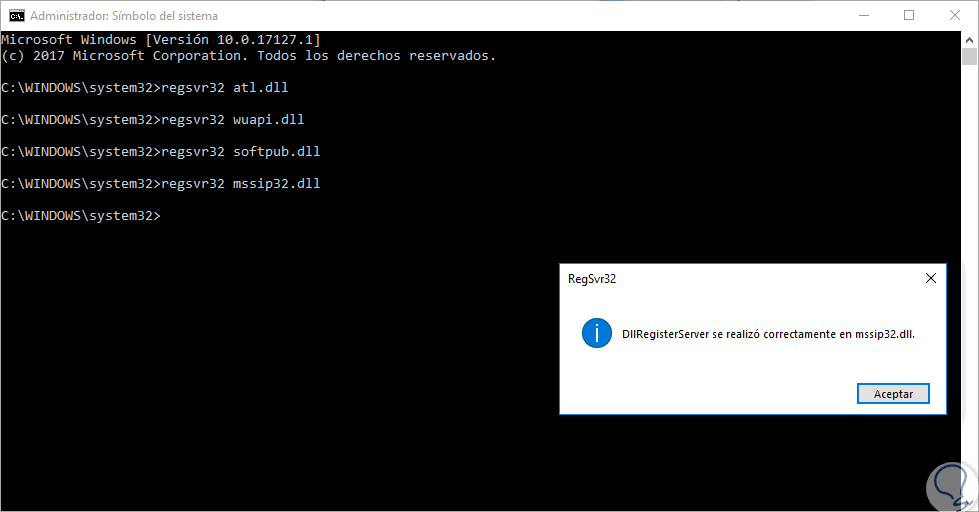 Otra de las soluciones disponibles para corregir el error en mención es registrar los archivos DLL relacionados con Windows Defender. Para esta acción, accederemos al símbolo del sistema como administradores y allí ejecutamos las siguientes líneas las cuales nos mostraran una ventana emergente de confirmación después de su ejecución: