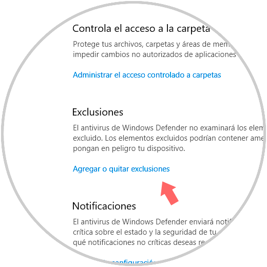 Damos clic en “Configuración de antivirus y protección contra amenazas” y en la nueva ventana vamos a la sección “Exclusiones” donde veremos lo siguiente: