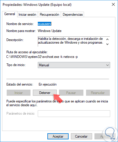 Una vez detenido el servicio, iremos a la siguiente ruta. Una vez eliminemos estos archivos, procedemos a reiniciar el equipo y una vez sea reiniciado, vamos de nuevo a las propiedades del servicio “Windows Update” y establecemos su valor en manual.