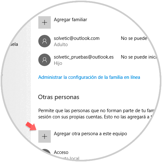 Allí pulsamos en el botón “Agregar otra persona a este equipo” y crearemos una cuenta local, no cuenta de Microsoft, para Windows 10: