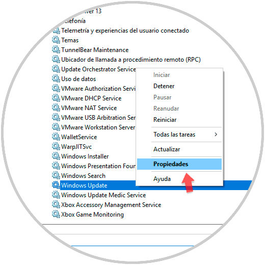 Para borrar esta carpeta, primero usaremos las teclas siguientes y ejecutamos el comando services.msc luego, en la nueva venta, ubicaremos el servicio llamado "Windows Update", allí daremos clic derecho sobre el y seleccionamos la opción "Propiedades":