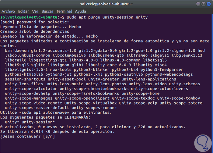 Alli ingresamos la letra S para confirmar la eliminacion de Unity en Ubuntu 17.10.