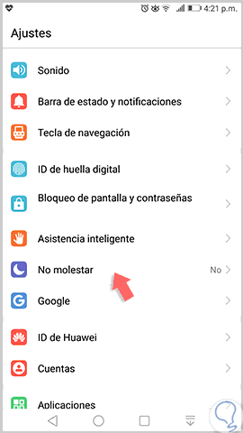 Para acceder a la función No molestar en Android, iremos a “Ajustes” y allí ubicamos la línea “No molestar”: