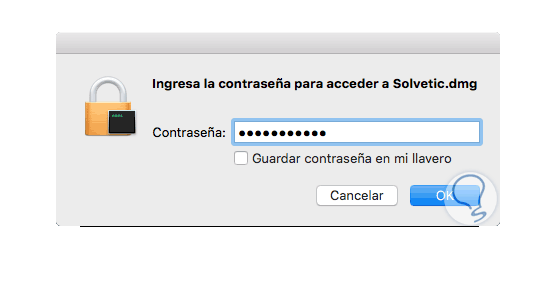 Para montar la imagen y trabajar en ella, basta con dar doble clic sobre la imagen .dmg y automáticamente veremos la siguiente ventana donde ingresaremos la contraseña asignada: