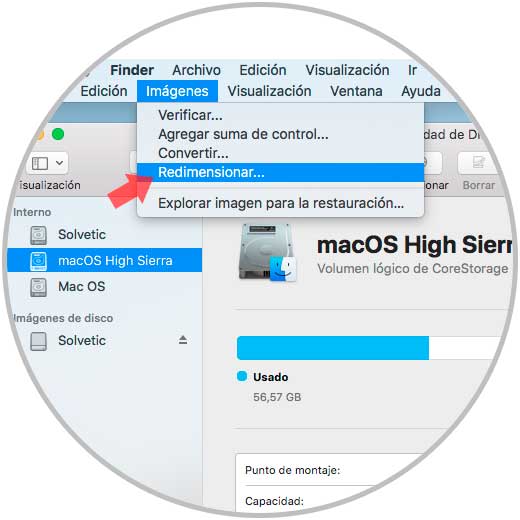 En algunos casos puede ser necesario que necesitemos más o menos espacio del asignado originalmente, si este es el caso, vamos a la Utilidad de discos y nos dirigimos al menú “Imágenes / Redimensionar”: