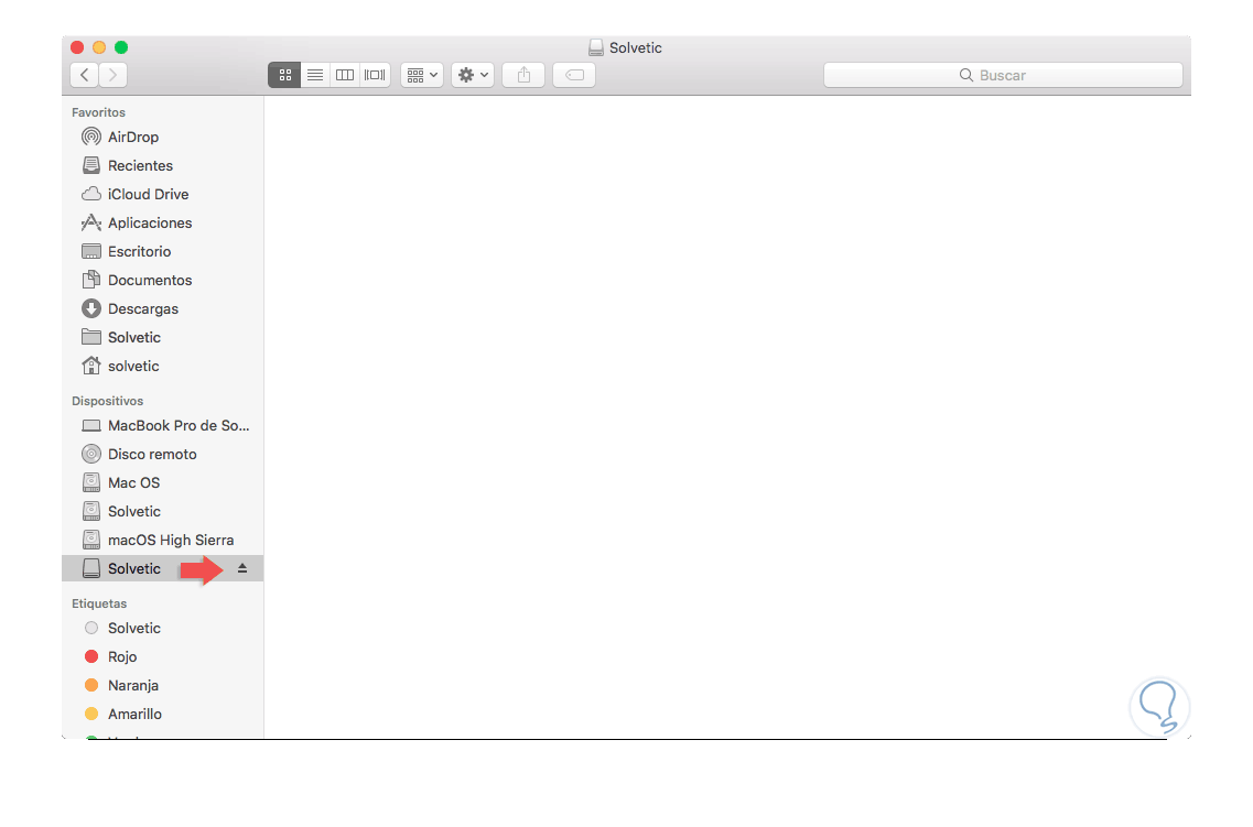 Una vez hayamos realizado las respectivas acciones en la unidad, podemos ir al Finder y desde allí expulsar la imagen dando clic en el icono de expulsión de la unidad ubicado en el lado derecho de la misma: