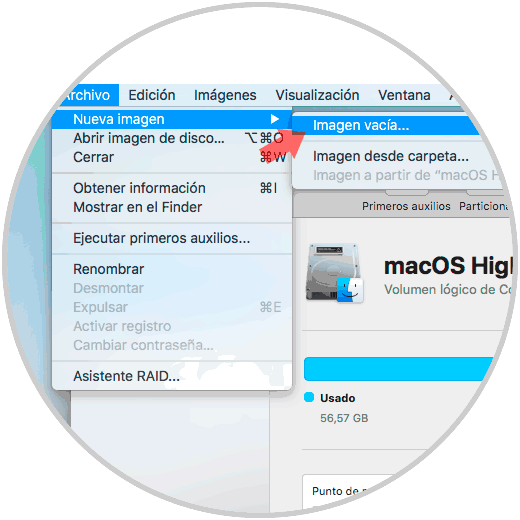 Una vez accedamos a la utilidad de discos vamos al menú “Archivo” y allí seleccionamos la opción “Nueva imagen / Imagen vacía”: