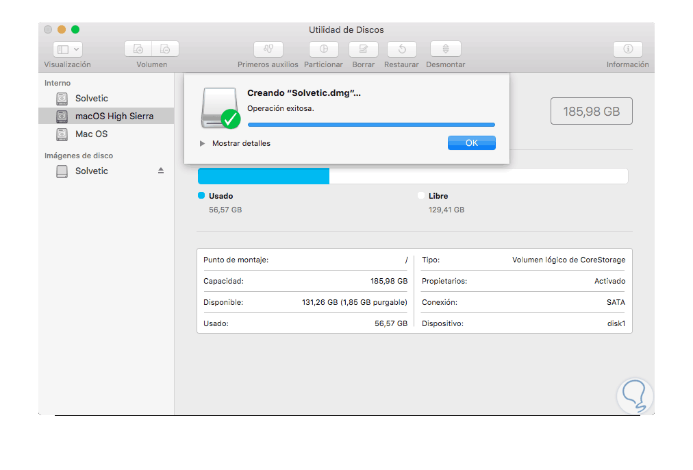 Es importante que recordemos la contraseña asignada ya que si la olvidamos es imposible acceder a la imagen seleccionada y no se recomienda almacenar la misma en el llavero de macOS High Sierra ya que cualquier usuario podría acceder a la imagen y administrar los elementos allí alojados. Podremos ver que por defecto la imagen es montada en el sistema operativo y podremos acceder a la unidad para realizar las acciones necesarias: