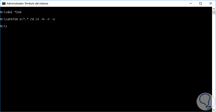 En este caso analizaremos la memoria USB la cual tiene asignada la letra N, en el símbolo del sistema ejecutamos n: para acceder a ella: