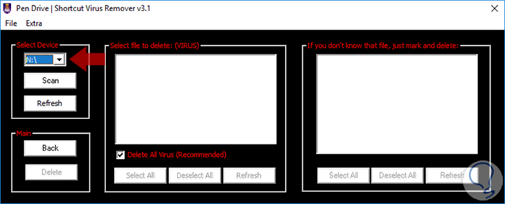 Allí seleccionamos la letra de la unidad a analizar y pulsamos en el botón Scan para iniciar el análisis, como vemos podemos activar la casilla Delete All Virus para remover de forma automática las amenazas.