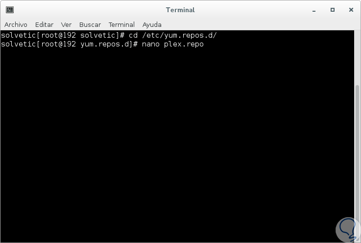 El primer paso a dar consiste en añadir el repositorio de Plex en CentOS 7, para ello, iremos al directorio yum.repos.d y crearemos un nuevo archivo repo llamado "plex.repo" usando el editor nano así: