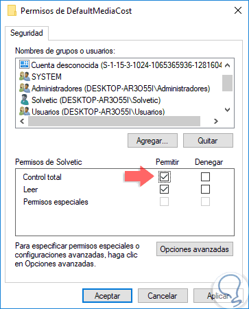 Pulsamos en Aceptar y ahora seleccionaremos el usuario añadido y activamos la casilla “Control total”: