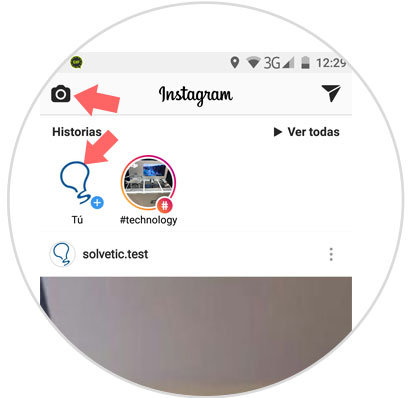 Entra en la aplicación de Instagram en tu teléfono móvil y una vez aquí pulsa en el avatar de la foto de perfil o en la cámara situada en la esquina superior izquierda para realizar una historia en Instagram.