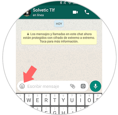Lo primero que tenemos que hacer es entrar en cualquiera de los chats de WhatsApp y seleccionar el símbolo de la carita en la parte superior del teclado.