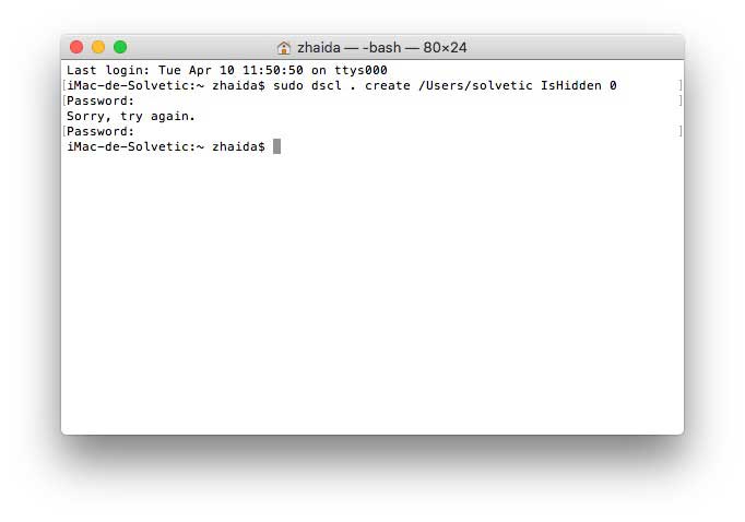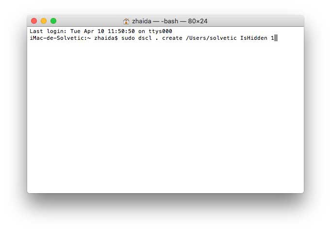 Una vez abierta, tienes que introducir el siguiente comando sustituyendo "hiddenuser" por el nombre original de la cuenta que quieres ocultar. En nuestro caso será solvetic.