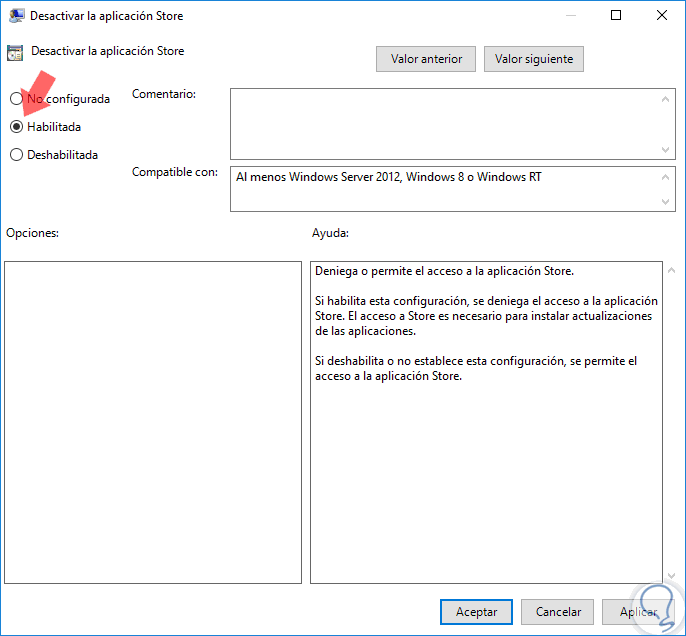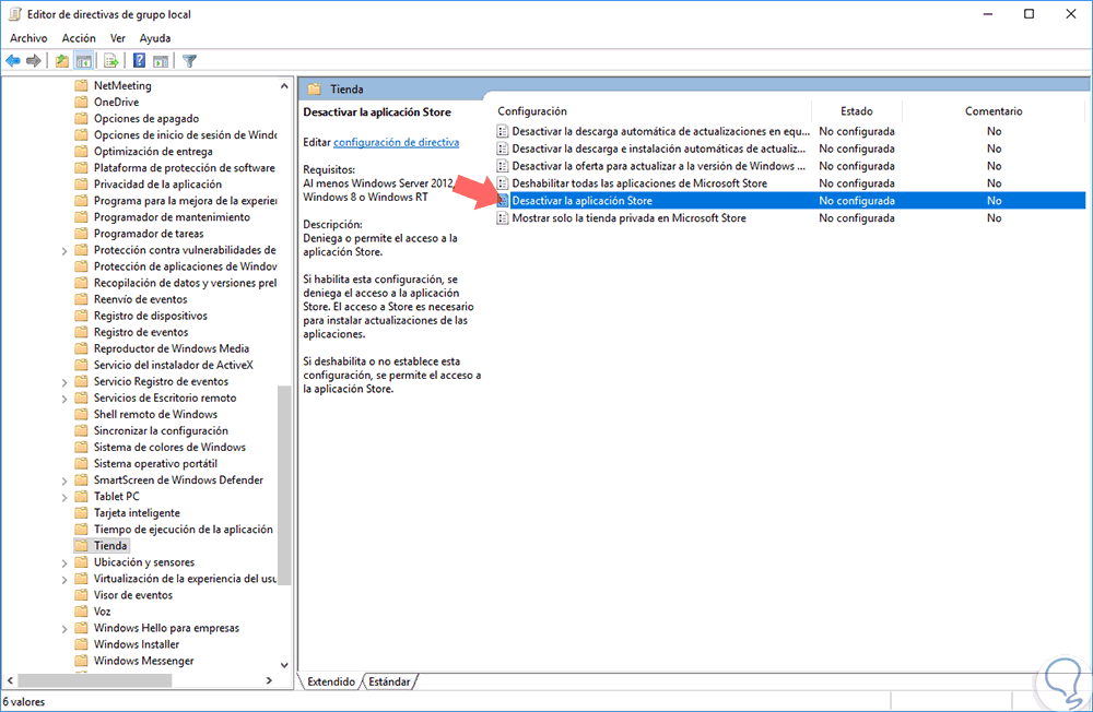 Allí daremos doble clic sobre la política llamada "Desactivar la aplicación Store":