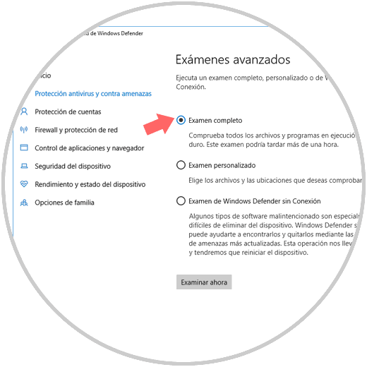 Para ello, vamos al "Centro de seguridad de Windows Defender" y en la sección "Protección antivirus y contra amenazas" y procedemos a ejecutar un análisis completo en búsqueda de amenazas: