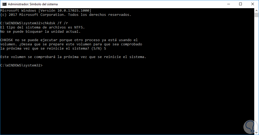 De este modo, cuando el sistema sea reiniciado hará un análisis detallado en el disco en búsqueda de errores: