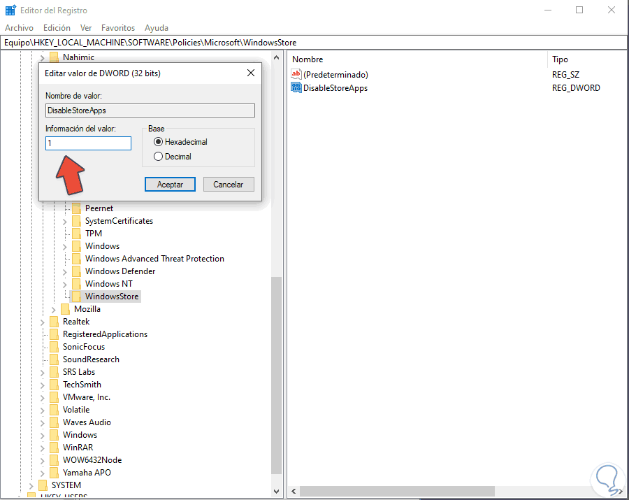 Ahora haz doble clic sobre el valor y dale un valor de 1 para activarlo. De esta forma desactivaremos las aplicaciones de Microsoft Store que puedan estar dando problemas.