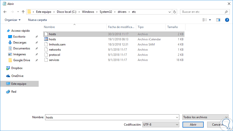 Para su verificación y edición debemos usar algún editor de texto como administradores e ir a la ruta indicada, seleccionar el archivo "Hosts" y pulsar en Abrir: