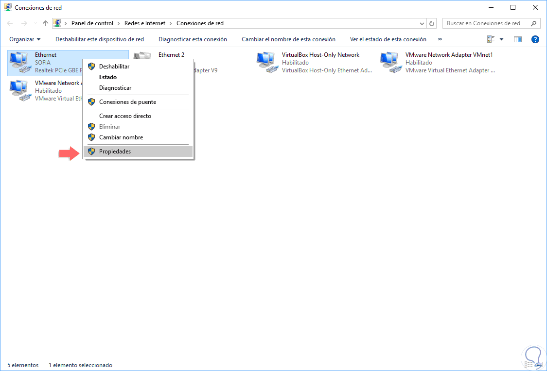 En la ventana emergente iremos a la línea “Protocolo de Internet Versión 4” y pulsamos sobre el botón “Propiedades”: