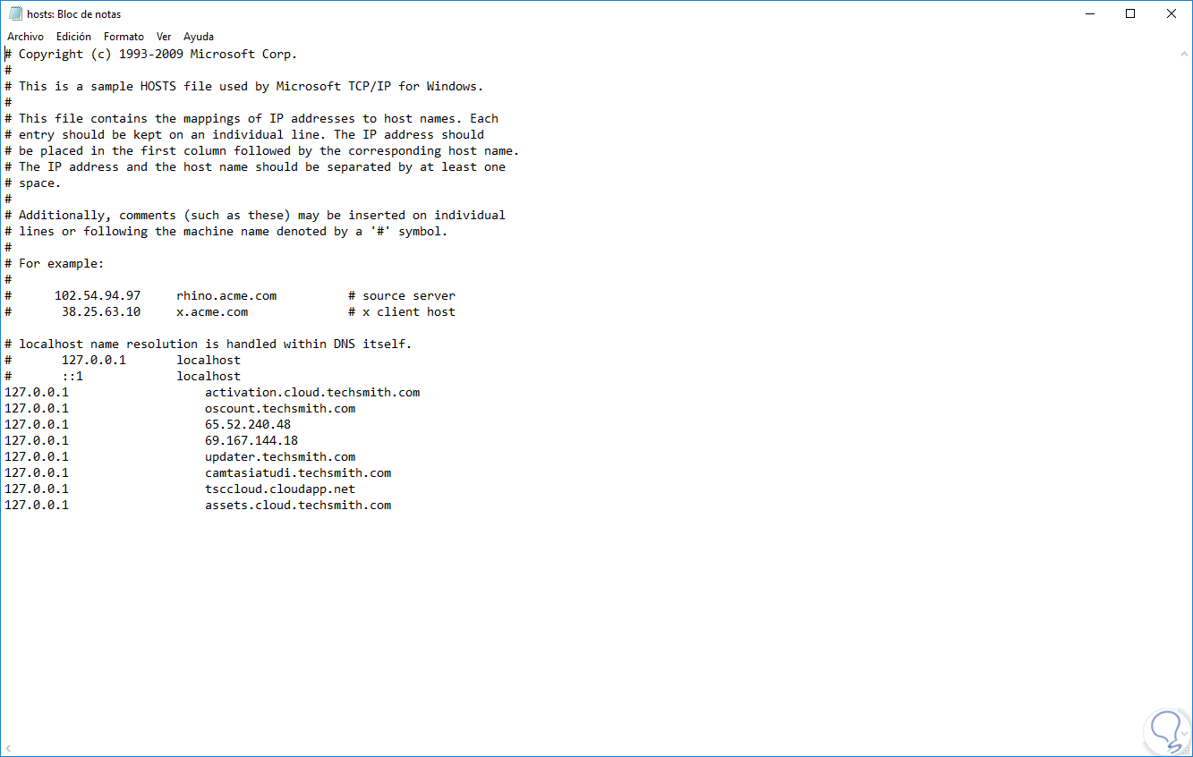 El archivo tendrá la siguiente apariencia. En caso de encontrar más direcciones IP debemos borrarlas ya que se estará impidiendo el acceso a dicho sitios.