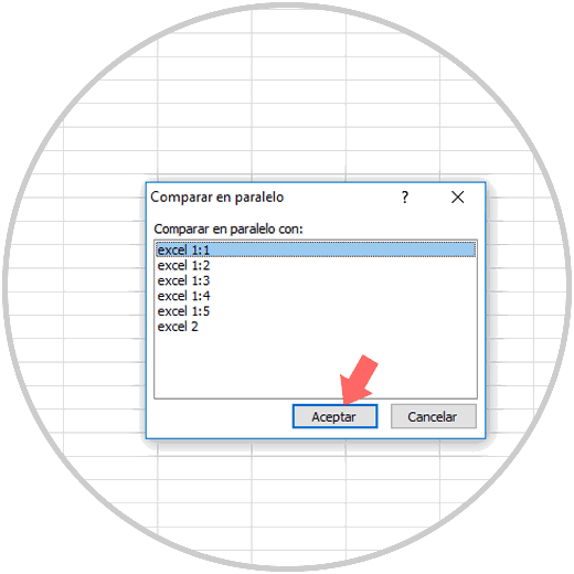Aparecerá una ventana emergente en la pantalla en la que aparecerán todos los Excel de tu PC y por defecto aparecerá marcado en azul el que abriste a la vez del que tienes abierto. Pulsa en “Aceptar”