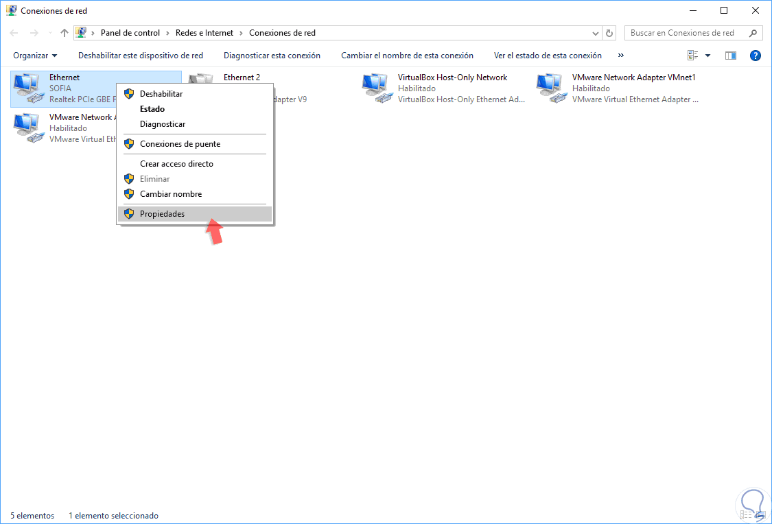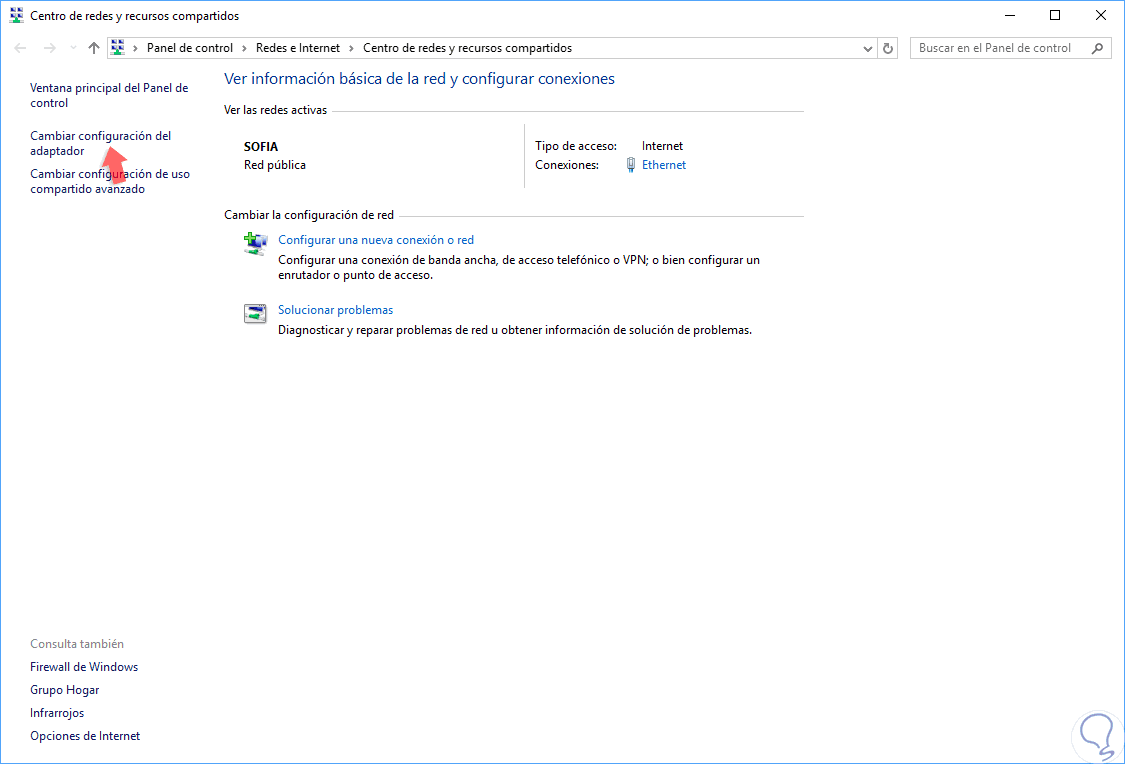 Allí damos clic en la línea “Cambiar configuración del adaptador” ubicada en el costado izquierdo y en la nueva ventana daremos clic derecho sobre el adaptador actual y seleccionamos la opción “Propiedades”: