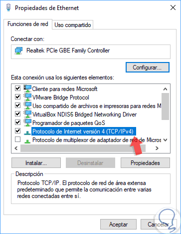 En la ventana emergente seleccionamos la opción “Protocolo de Internet versión 4” y damos clic en el botón “Propiedades”:
