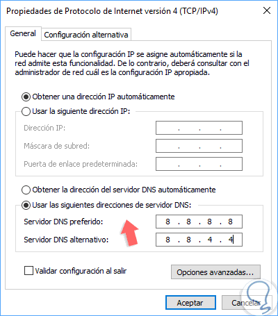 Ahora, activamos la casilla “Usar las siguientes direcciones de servidor DNS” y en los campos respectivos ingresaremos la dirección deseada así. Una vez realicemos esto pulsamos en el botón Aceptar para aplicar los cambios.