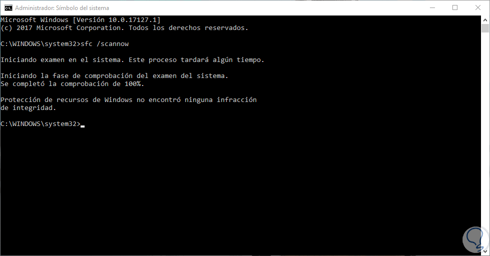 sfc /scannowEsto se encargará de realizar un análisis profundo al sistema de archivos y proceder con las correcciones de ser necesario: