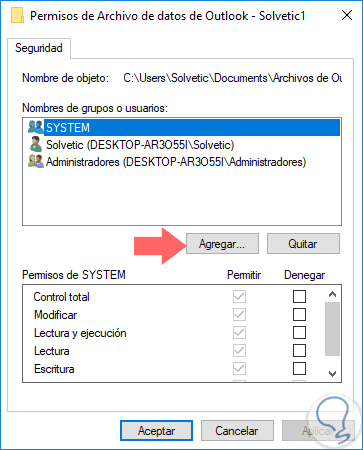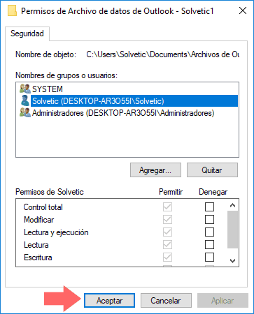 Luego daremos control total a este usuario sobre el archivo PST. Pulsamos en "Aceptar" para guardar los cambios.
