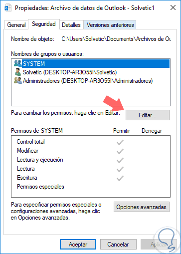 Para corregir esto, ubicaremos el archivo PST de la cuenta, damos clic derecho sobre él y seleccionamos "Propiedades", en la ventana desplegada vamos a la pestaña "Seguridad". Pulsamos en el botón "Editar"