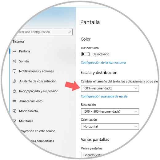 Para ello, daremos clic derecho en el escritorio y allí seleccionamos la opción "Configuración de pantalla", y en la ventana desplegada, en la sección "Escala y distribución", asignamos el porcentaje "100":