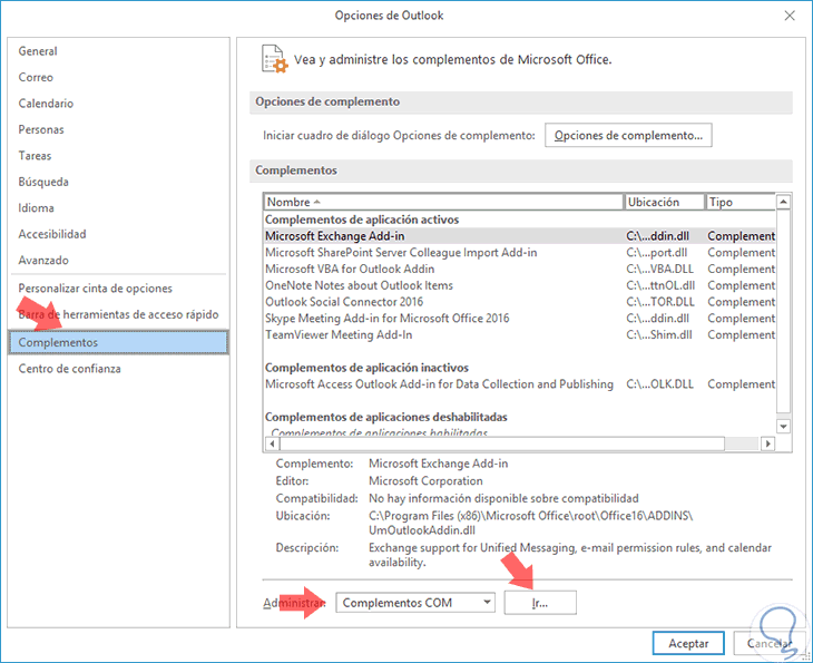 En la parte inferior derecha en el campo "Administrar", seleccionamos la opción "Complementos COM "y pulsamos en el botón "Ir" donde veremos lo siguiente: Allí desactivaremos las casillas respectivas de los complementos a deshabilitar y pulsamos en el botón "Aceptar" para aplicar los cambios.