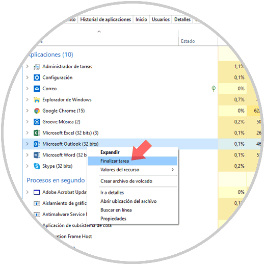 Para ello iremos al "administrador de tareas" y finalizamos el proceso dando clic derecho sobre el y seleccionando la opción "Finalizar tarea":